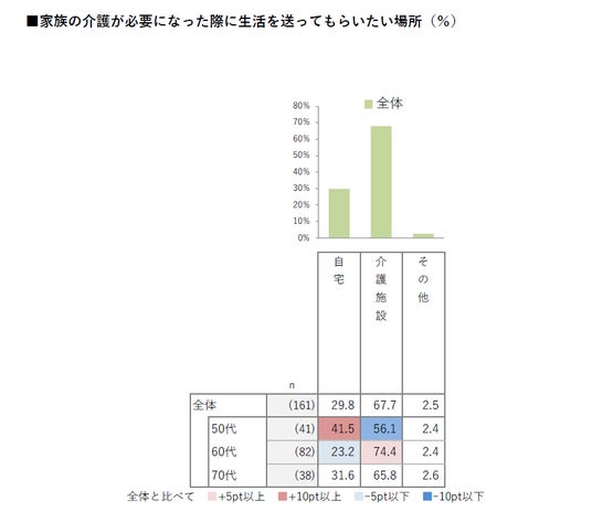 - 一方、家族の介護が必要になった際に生活を送ってもらいたい場所1位は「介護施設」で約7割。年代による差が大きく、50代は約10ポイント以上全体より少なく、その分「自宅」が多い。
