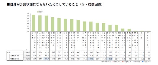 - 自身が介護状態にならないためにしていることは、食事・運動・健康診断が6割超。ほとんどの項目で「介護経験あり」の方が割合は高いが、特に健康診断は約9ポイントの差が付いている。