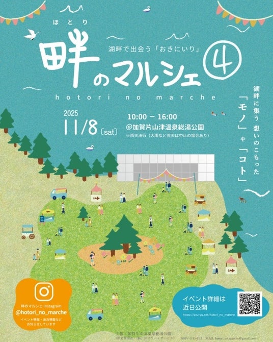「湖畔で出会うお気に入り」をテーマに、農産物やグルメ、雑貨、アパレル、工芸など、多彩なブースが並ぶマルシェです。ワークショップや体験ブースも充実。片山津温泉・総湯芝生広場で、秋の休日をゆったりと過ごせます。