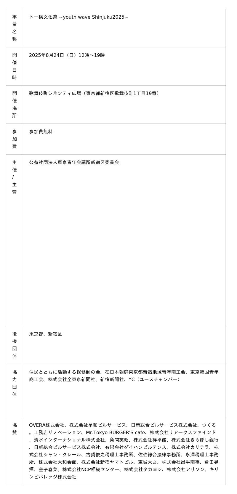 公益社団法人東京青年会議所新宿区委員会は、2025年8月24日(日)に「トー横文化祭 ~youth wave Shinjuku2025~」を歌舞伎町シネシティ広場にて開催いたします。