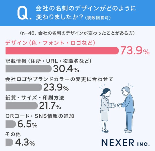 73.9%が「デザイン(色・フォント・ロゴなど)」、30.4%が「記載情報(住所・URL・役職名など)」、23.9%が「会社ロゴやブランドカラーの変更に合わせて」、21.7%が「紙質・サイズ・印刷方法」と回答しました。