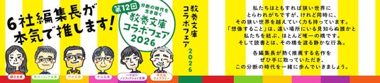 第12回「6社編集長が本気で推す 教養文庫コラボフェア 2026」が、2026年1月23日ごろより全国書店にてスタートいたします! 朝日文庫、角川ソフィア文庫、河出文庫、中公文庫、ハヤカワ・ノンフィクション文庫、平凡社ライブラリー(五十音順)の6レーベルが共同で開催するこの「教養文庫コラボフェア」(旧名「チチカカコヘ」フェア)は、名称や参加レーベルなど概要を少しずつ変えながら11年間継続し、第12回目を迎えました。昨年から朝日文庫とハヤカワ・ノンフィクション文庫の2レーベルが新しく参加しています。