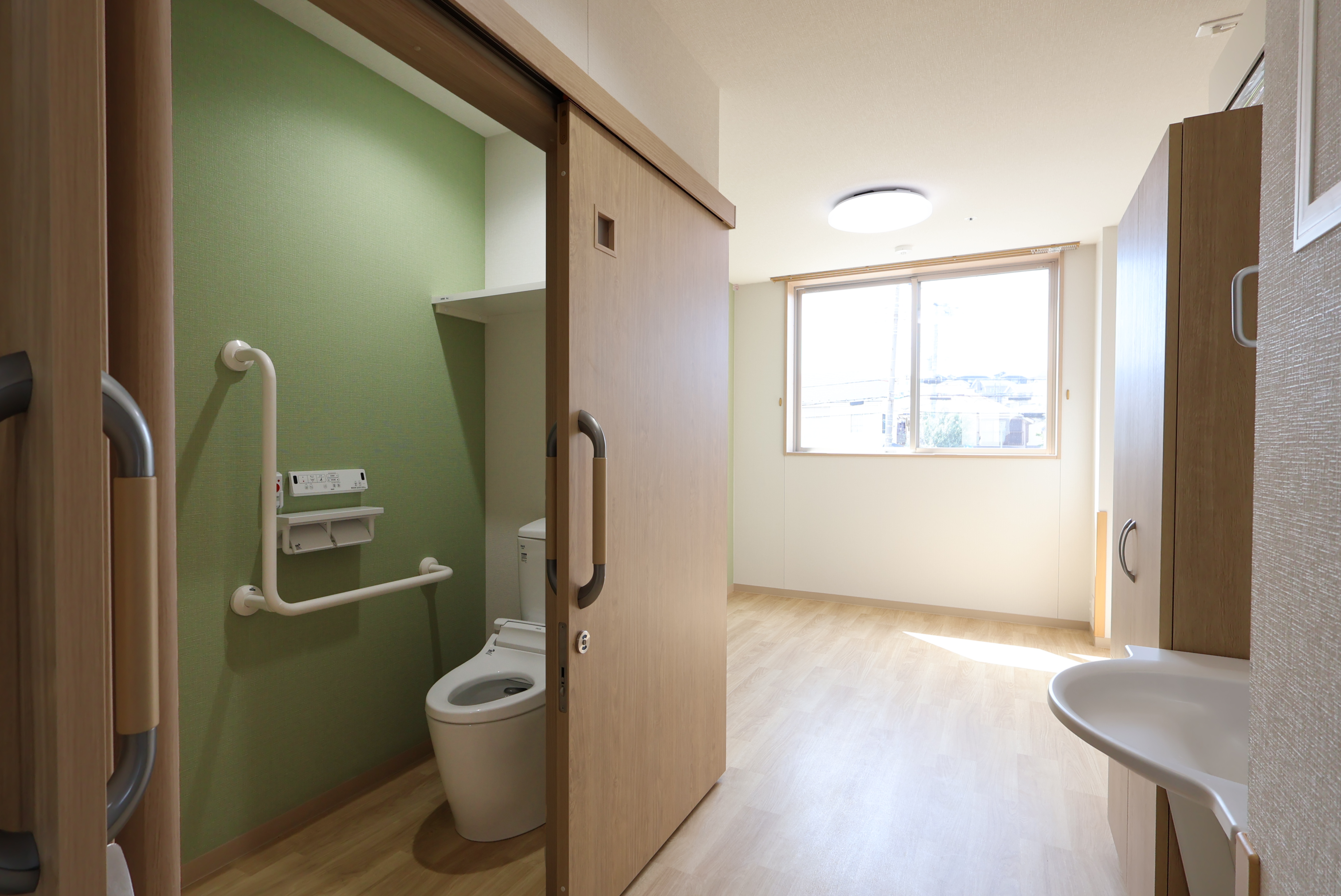館内は全てバリアフリー対応で足が不自由な方、車いすで移動される方も安心安全でご利用いただけます。各居室には洗面台、エアコン、収納棚、個室トイレを完備しており、プライバシーに配慮した完全個室をご用意しております。
