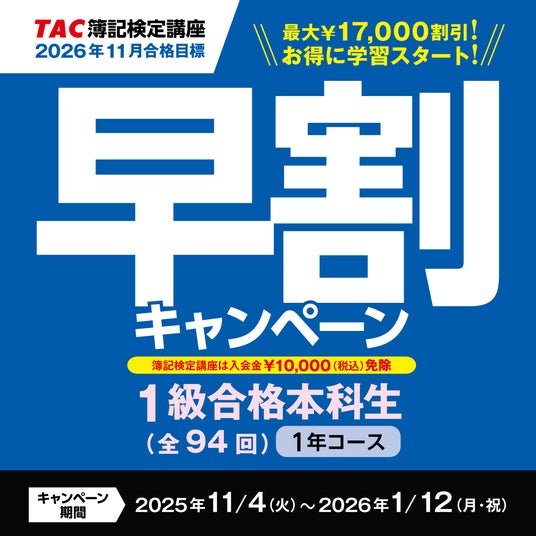 日商簿記検定対策講座を展開しているTAC株式会社(東京都千代田区、代表取締役:多田敏男)は、2026年11月日商簿記検定1級合格を目標とする『1級合格本科生』のオトクなキャンペーンを実施中。受講料最大17,000円割引に加え『先行学習特典』も!簿記1級を目指す方がオトクに学習を始められるまたとないチャンスです!