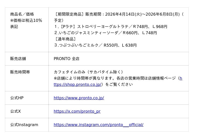 株式会社プロントコーポレーション(本社:東京都港区、代表取締役社長:杉山和弘)は、飲食チェーン『PRONTO(プロント)』のカフェタイム(サカバタイム除く)にて、「ストロベリーヨーグルトラテ」および「いちごのジャスミンティーソーダ」を、2026年4月14日(火)より発売します。