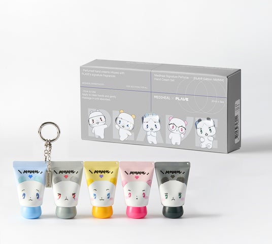 PLAVEの世界から迷い込んだふしぎな生きものムメミム(MMMM)とコラボした限定パッケージで、PLAVEのメンバーたちのシグネチャーパフュームがほのかに香る『ハンドクリーム 5種』。シアバター(シア脂:整肌成分)を配合した、べたつかず肌馴染みの良いテクスチャーで、手肌を優しく包み込みます。