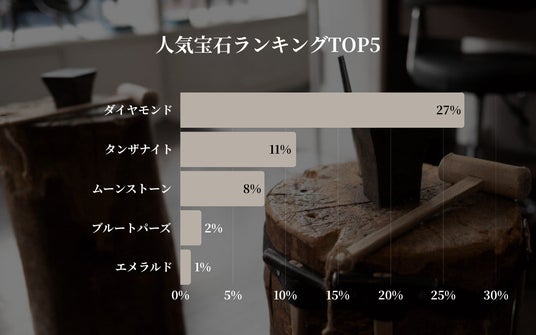 2位はタンザナイト(11%)、3位にムーンストーン(8%)が続き、ブルートパーズ(2%)、エメラルド(1%)が続く形となりました。前回からラインナップが大きく入れ替わり、今回はタンザナイトとブルートパーズ、エメラルドが新たにランクインしたことが注目されます。タンザナイトは「幸運」や「変革」を象徴するとされ、新たな人生の門出を飾るペアリングストーンとしてお選びになるカップルが多いと考えられます。また、ムーンストーンは「愛の成就」を意味するとも言われており、パートナーへの深い想いを石に込めたいというご要望に応える選択として支持されているのではないでしょうか。