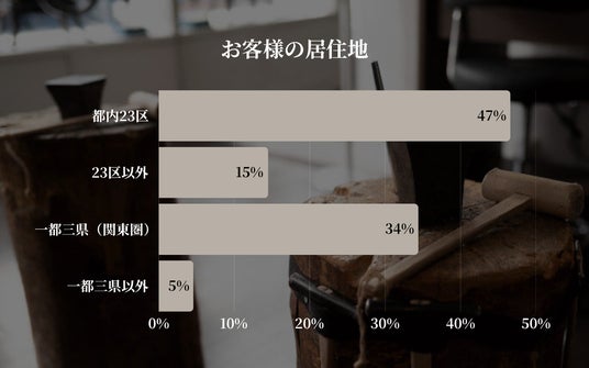 今回のご利用者様の居住地アンケートを集計した結果、「都内23区」が47%でトップとなりました。続いて「一都三県(関東圏)」が34%となり、この2つのカテゴリーだけで全体の81%を占める結果となっています。また、「23区以外」は15%、「一都三県以外」は5%となっており、さまざまなエリアからお越しいただいていることが改めて確認できました。