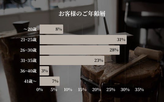 今月の手作りペアリング制作サービスをご利用いただいたお客様の年齢層を集計した結果、最も多かったのは21歳から25歳の層で31%、次いで26歳から30歳が28%という結果となりました。20代全体では59%と半数以上を占めており、引き続き20代のお客様がサービスの中心的な担い手となっています。