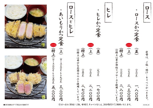 ※上記他、とんかつの豚肉を使用した生姜焼き、メンチカツ、おつまみメニュー、ソフトドリンク、