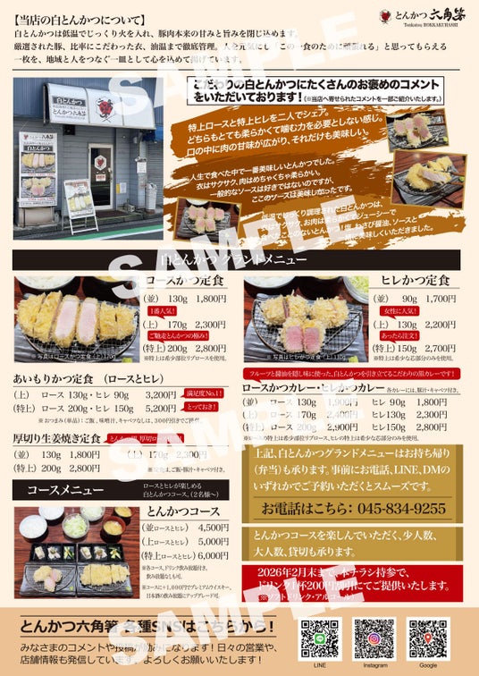 横浜市神奈川区の六角橋エリアに根付く白とんかつ専門店「とんかつ六角箸(ろっかくはし)」(本社:神奈川県横浜市、株式会社開物成務 代表者 田中 朋行(たなか ともゆき))は、この度、期間限定でお客様還元イベントと称し「2025年12月23日~25日 歳の瀬三日間&新年のお振る舞いイベント」を開催いたします。2025年3月より、白とんかつ専門店としてリニューアルオープンし、地域の皆様や、たくさんのお客様に支えていただき、今年を無事に乗り越え、来年度も元気に営業をスタートしていけることに感謝をし、六角箸の自慢の「白とんかつ」を少しでも多くの方へお届けしたいと考え企画し、開催することとなりました。また、年始2026年1月4日~11日の期間は、通常11,500円分として使える「プレミアムパス」を9,000円で販売!ロースかつ定食やヒレかつ定食を思う存分お楽しみいただけます。試行錯誤を重ねてたどり着いた、見た目も美しい低温調理のご馳走「白とんかつ」の贅沢な味わいを是非ご堪能ください!