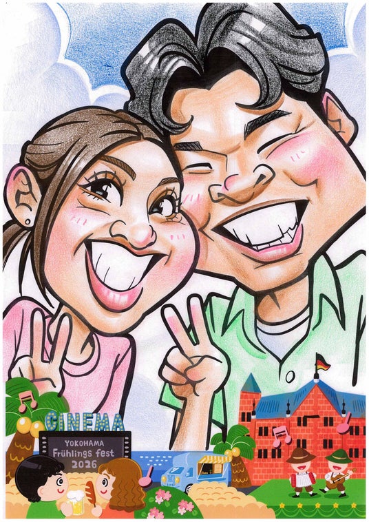 ヨコハマフリューリングスフェストの賑やかで楽しい雰囲気を表現した、期間限定の特別背景の中に似顔絵をお描きします。