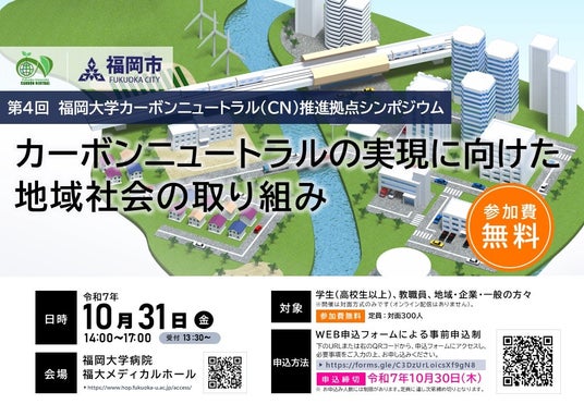 福岡大学は、10月31日(金)、「第4回福岡大学カーボンニュートラル推進拠点シンポジウム」を開催します。地球温暖化という世界規模の課題に対応するとともに、我が国が目指す2050年のカーボンニュートラル(CN)社会の創生に向けて、本学では2022年4月に「福岡大学CN推進拠点」を設置し、CN推進プロジェクトが始動しました。本シンポジウムは、本学におけるCNの教育・研究や地域社会・企業の取組内容を社会に広く知ってもらうために2022年から開催しています。