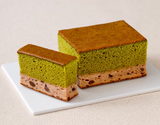 新鮮素材と安心の品質京都宇治の抹茶を使用したカステラ生地と、北海道大納言小豆を練り込んだ、つぶ餡ベースのカステラ生地を二層に重ねた、三源庵の人気商品。