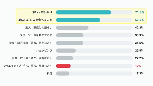 自由記述では、近郊の散歩や神社めぐりから、「年に1度の沖縄旅行」や「海外への旅行」まで規模は様々ですが、外に出て非日常の景色や体験を味わいたいという強い思いが見受けられます。