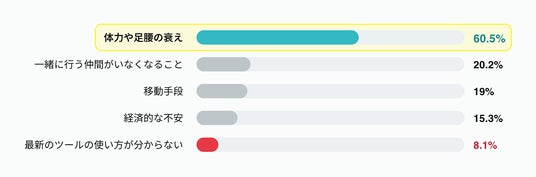 - 最大の恐怖は身体的な衰え楽しみを阻む不安要素のトップは「体力や足腰の衰え(60.5%)」。対して、「最新ツールの使い方がわからない」というデジタル不安はわずか8.1%と、全項目で最低水準に。