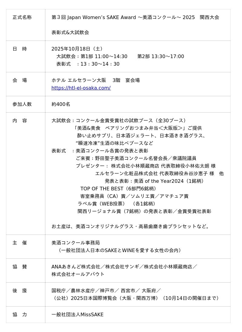 国内初の女性審査員による国際日本酒品評会「Japan Women’s SAKE Award~美酒コンクール~(通称:美酒コン)」。「地酒のある地域の活性」という理念から、第3回は大阪・関西万博の盛り上がりのもと関西大会となりました。2025年10月18日(土)の表彰式では、美酒コンクール名誉会長野田聖子衆議院議員をお迎えし、金賞受賞の表彰とともに、6部門の【TOP OF THE BEST】(6社)、「客室乗務員(CA)賞」(1社)「ソムリエ賞」(1社)「アマチュア賞」(1社)「関西リージョナル賞」(7府県7社)「ラベル賞」(WEB投票・1社)の特別各賞、そして、今年の最高峰である『美酒 of the Year 2025』(1社のみ)の発表と表彰が行われました。試飲ブースが広がる会場、ホテルエルセラーン大阪には約400名の来場者・関係者が詰めかけ、華やかな表彰式となりました。