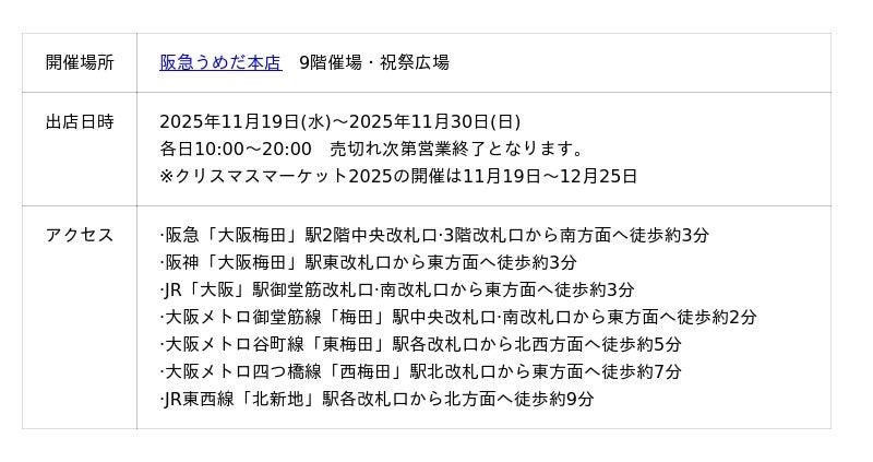 2025年11月19日から11月30日までの12日間の期間限定で、阪急うめだ本店9階催事場に出店