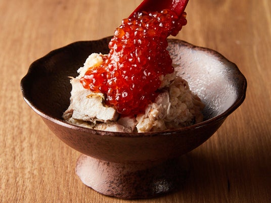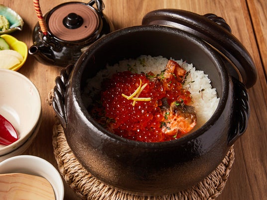 炉端BeeNの“締めのごちそう”注文を受けてから炊き上げる「鮭といくらの土鍋ご飯」。