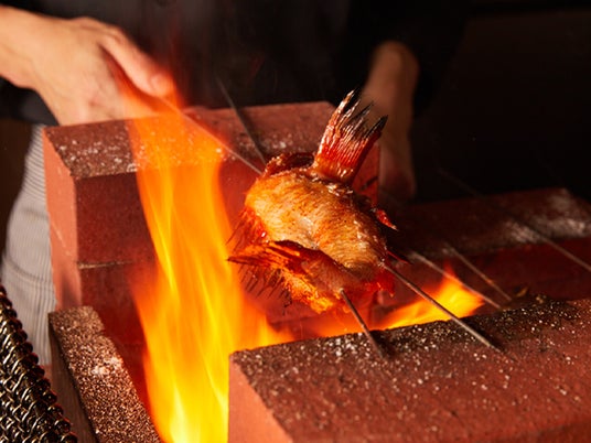 カウンター奥の囲炉裏では、焼き師が炭火を操りながら旬の食材を一品ずつ丁寧に焼き上げます。