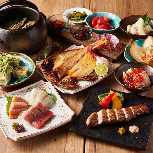 旬魚三種造り、魚の炉端焼き、鮭といくらの土鍋ご飯など、季節の逸品を中心に構成。