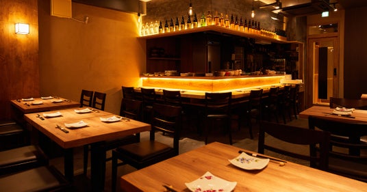 やさしい灯りと木の温もりに包まれた店内。カウンター奥では炭火の音と香りが静かに漂う。