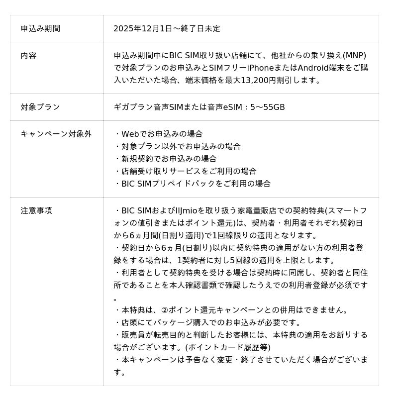 ビックカメラグループが提供する「BIC SIM powered by IIJ(以下、BIC SIM)」は、2025年12月1日(月)より、ビックカメラグループ店頭申込み限定で新型iPhone17シリーズを含むSIMフリーiPhoneと人気の最新Android端末が最大13,200円割引、または他社からBIC SIMへのお乗り換えでビックポイントを10,000ポイント還元します。