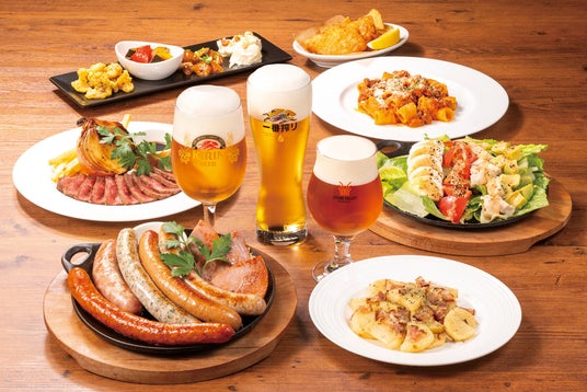 料理は、定番のソーセージやジャーマンポテト、人気の「あか牛の旨塩焼き」に加え、月毎に野菜や魚介などの素材が変わる『おすすめ素材メニュー』や3か月限定の『季節の特別メニュー』などがございます。