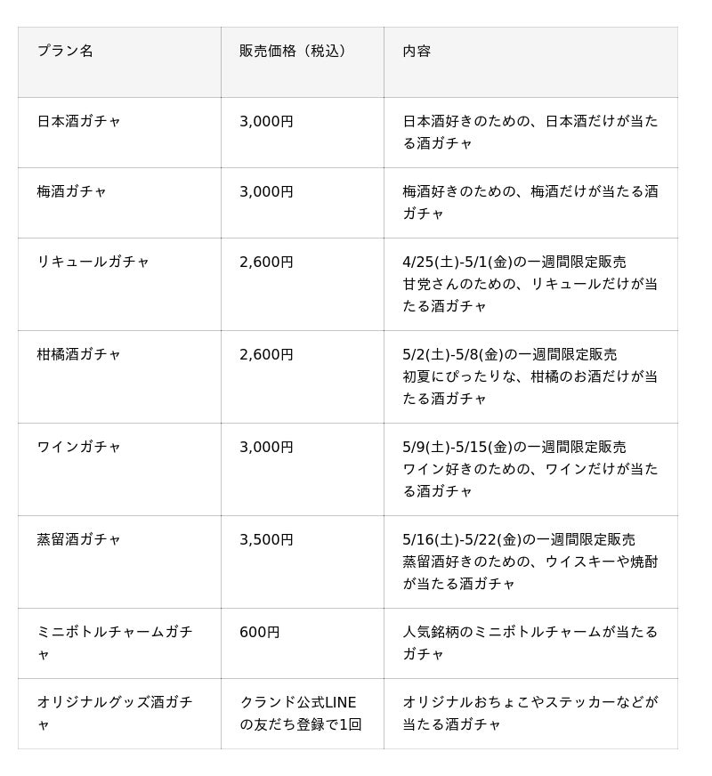当たるお酒のラインナップには1本33,000円(税込)の30年熟成させたワイン「THE SECRET -Premium 1996 Vintage Koshu-」などのレアなお酒も入ります。他にもGW期間限定の酒ガチャなど、販売期間が限られた限定の酒ガチャも登場します。ハズレは一切なく、必ず酒ガチャの金額よりも定価の高い商品が当たるようになっているため、どなたでも安心してお楽しみいただけます。自分では選ばない新しいお酒との出合いをぜひご体験ください。