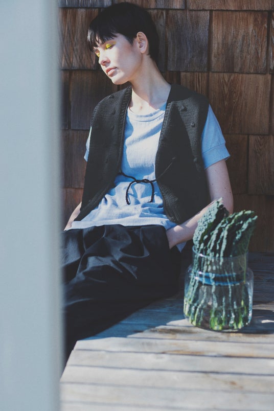 Tシャツ:「tops "gauze"」 8,800円(税込・2月発売予定) ベスト:「hand knit vest "bonbon"」 18,700円(税込・3月発売予定) パンツ:「pants "kapok"」 17,600円(税込・4月発売予定)
