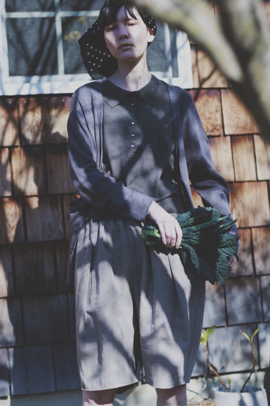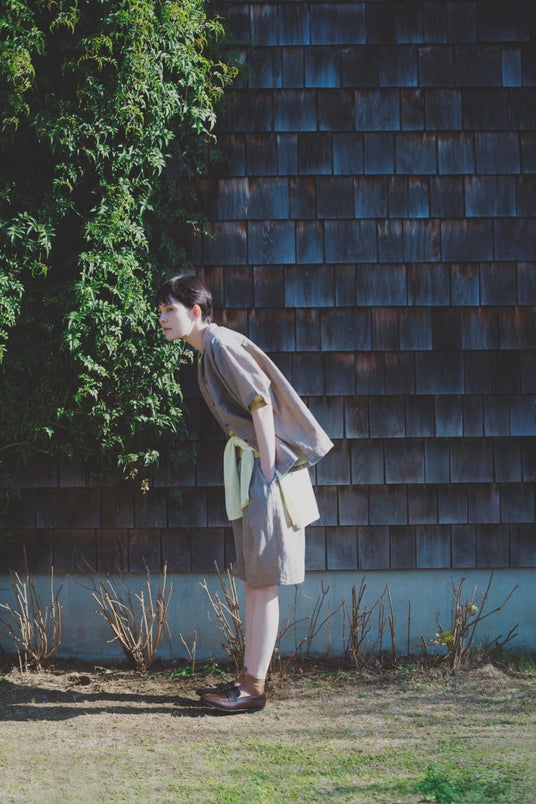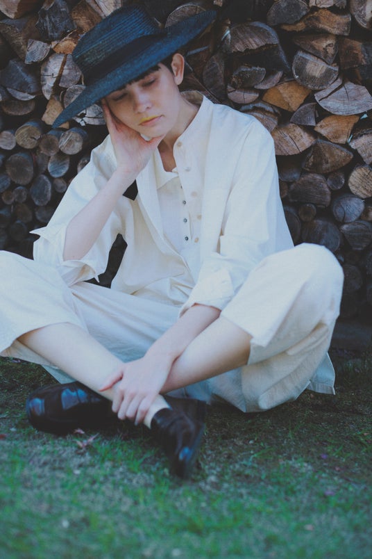 シャツ:「shirt "soil"」 19,800円(税込・4月発売予定) 中に着たニット:「knit tops "polo" 5」 13,200円(税込・4月発売予定) ボトムス:「pants "soil"」 20,900円 (税込・4月発売予定) 腰に巻いたニット:「knit tops "homme"」 13,200円(税込・2月発売予定)