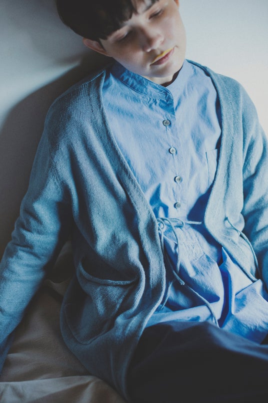 シャツ:「stand collar shirts "noble"」 19,800円(税込) カーディガン:「cachecoeur knit "room"」 17,600円(税込)