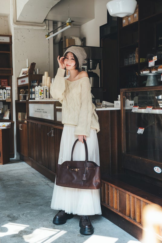 OUTER ¥25,300 / KNIT CARDIGAN ¥14,300 / SKIRT ¥10,450