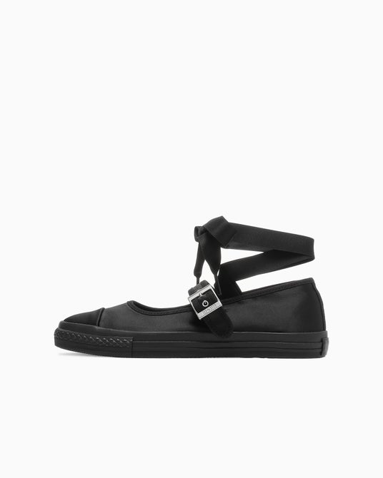 バレエコアの要素を取り入れたオールスターのアレンジによるウィメンズモデル。 通常のオールスターよりテープ位置を低めに設定することで、トレンド感のあるすっきりとした薄底シルエットに仕上げています。アッパーには上品な光沢感のサテンを採用し、足首を固定するリボンテープをイメージしたコットンサテンのテープを付属。テープはシューズ内側のループに通す仕様とすることで、取り外してシンプルなメリージェーンとして履くことも可能です。「ALL★STAR」の刻印入りバックルを採用し、ベルト裏にゴアを隠すことで着脱性とフィット性に配慮。インソールには、通気性とクッション性に優れるオープンセル構造のウレタンフォームとE.V.A.ウェッジを組み合わせた設計を採用しています。