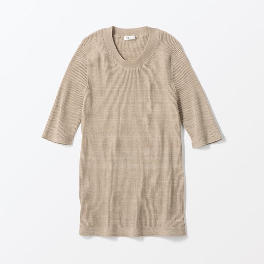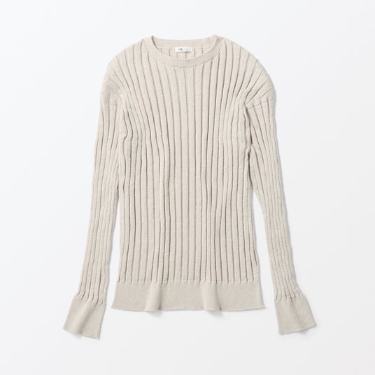 山形県内の老舗紡績・ニットメーカーで行き場をなくしていた糸を使用した、リブロングスリーブニットです。通気性・吸水速乾性・軽さを備えた紙を含む糸で編んでおり、ざっくりとして軽やかな肌触りです。シンプルなデザインでさらっと1枚で着ても上品な印象になり、幅広いコーディネートが楽しめます。