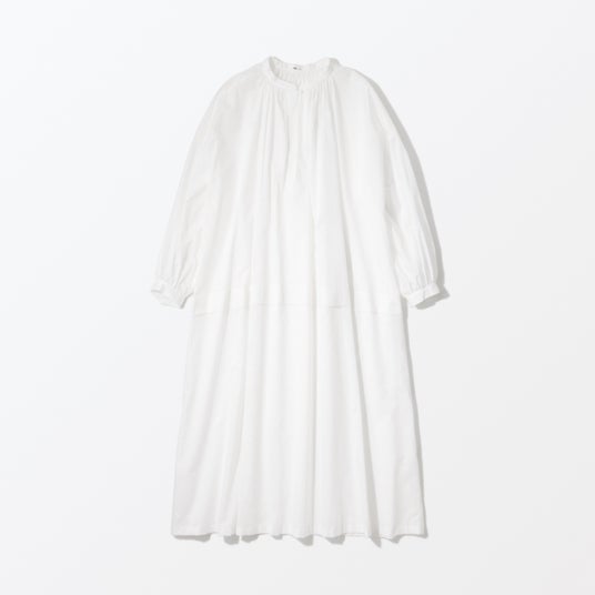 透け感のある薄手のコットン素材を生かし、たっぷりとギャザーを施した軽やかな仕上がりのワンピースです。1枚の生地で仕立てているため、縫い目がなく、生地本来の繊細さが引き立ちます。ローウエストのタックと、襟元の小さなボタンがアクセントになっています。