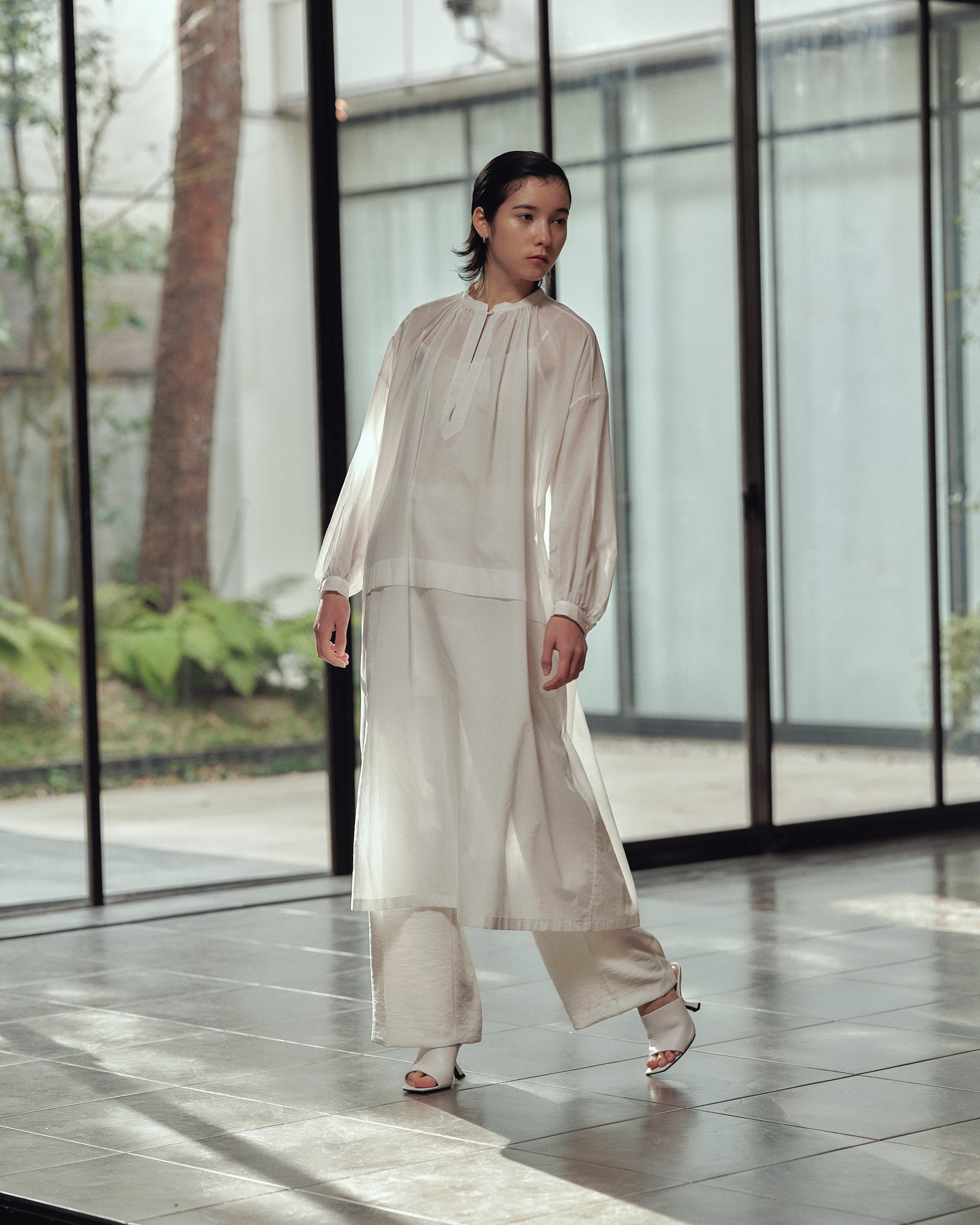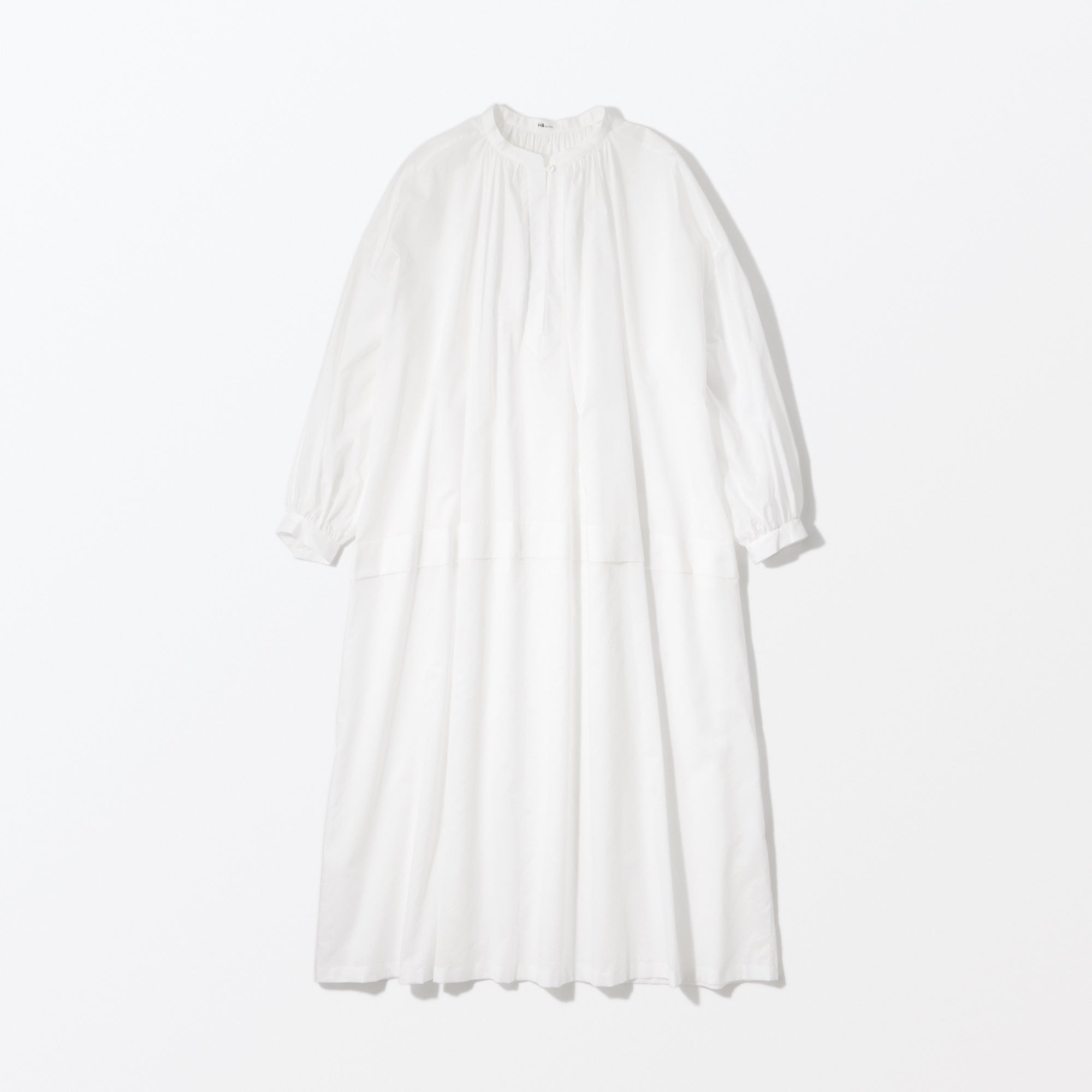 透け感のある薄手のコットン素材を生かし、たっぷりとギャザーを施した軽やかな仕上がりのワンピースです。1枚の生地で仕立てているため、縫い目がなく、生地本来の繊細さが引き立ちます。ローウエストのタックと、襟元の小さなボタンがアクセントになっています。