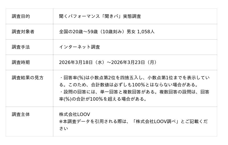 プレゼンテーションの自動化・資産化によりビジネスコミュニケーションの新しいインフラを社会に実装する「TALKsmith(トークスミス)」を展開する、株式会社LOOV(本社:東京都目黒区、代表取締役CEO:内田雅人、以下当社)は、20~50代のビジネスパーソン1,058人を対象に、「聞くパフォーマンス(以下、聞きパ)」の実態に関する調査を実施しました。