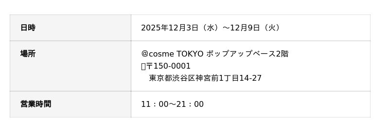 『永遠の美しさへの夢が、 夢に終わらない未来を創りあげること』を使命に掲げる、化粧品の研究開発・製造販売を行う株式会社エテルナム(本社:東京都渋谷区、代表取締役:松本隆明)は、2025年12月3日(水)~12月9日(火)の期間中、@cosme TOKYOポップアップベース2階にてPOP UPを開催。本イベントでは、ヒト臍帯由来間葉系幹細胞培養上清液を高配合したスキンケア製品「エテルナム」シリーズ、話題のリップセラムを実際にお試し、購入いただけます。
