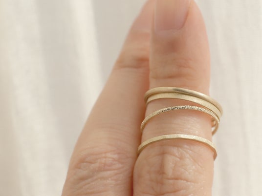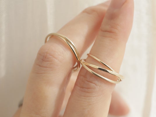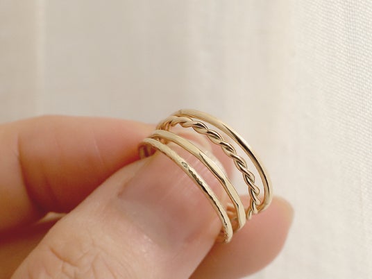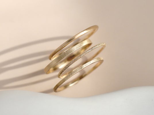 繊細な10 金の地金に、プレーン、マット、槌目(つちめ)など異なるテクスチャーを宿した10 本の地金リング。
