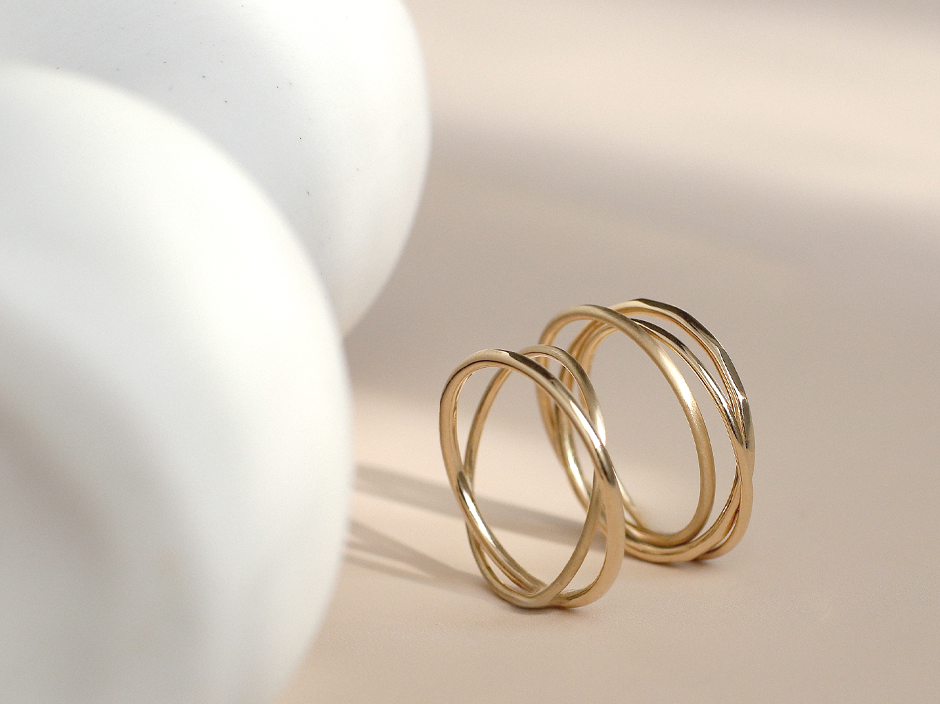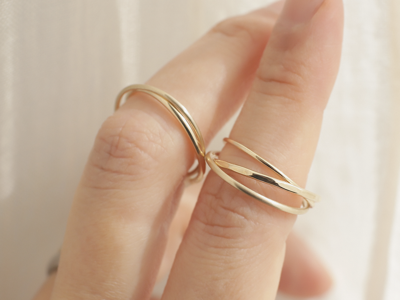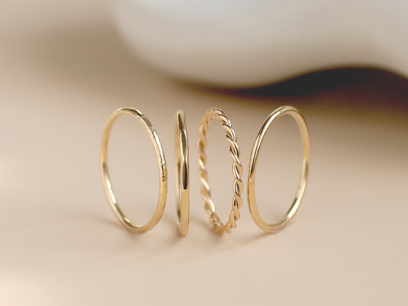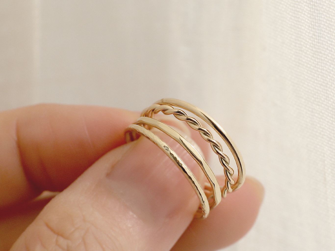 繊細な10 金の地金に、プレーン、マット、槌目(つちめ)など異なるテクスチャーを宿した10 本の地金リング。