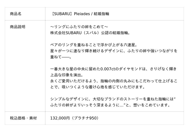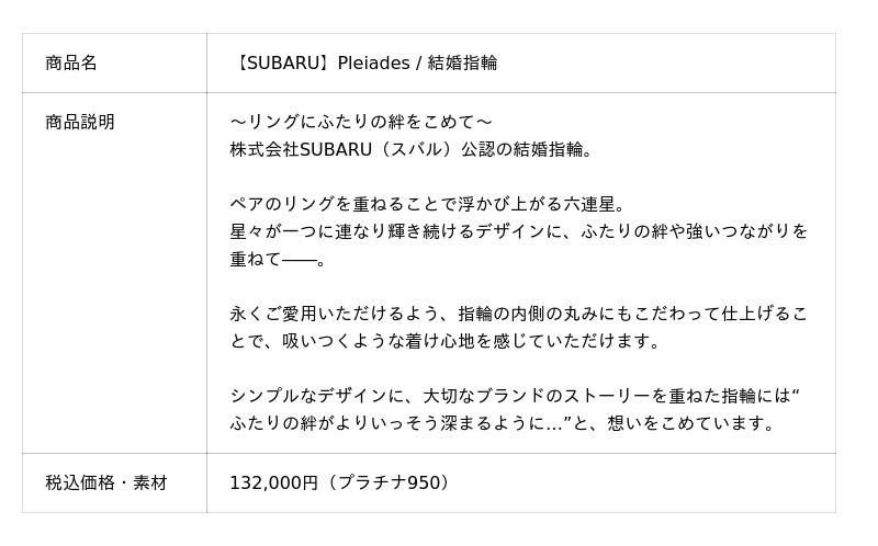 株式会社ユートレジャー(本社:東京都新宿区、代表取締役社長:青木 興一、株式会社ケイ・ウノの連結子会社)は、株式会社SUBARUとコラボレーションした「結婚指輪(マリッジリング)」を2025年12月24日(水)に発売します。ユートレジャーオンラインショップ、ユートレジャーコンセプトストア池袋にて取り扱います。ユートレジャーでは初めての取り扱いライセンスとなります。