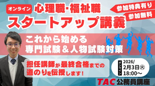 資格取得に向けた教育サービスを展開しているTAC株式会社(東京都千代田区、代表取締役社長:多田 敏男)では、心理職・福祉職 公務員試験を検討されている方へ向けて「心理職・福祉職 公務員スタートアップ講義」を、2/3(火)18:00~、オンラインで開催します。