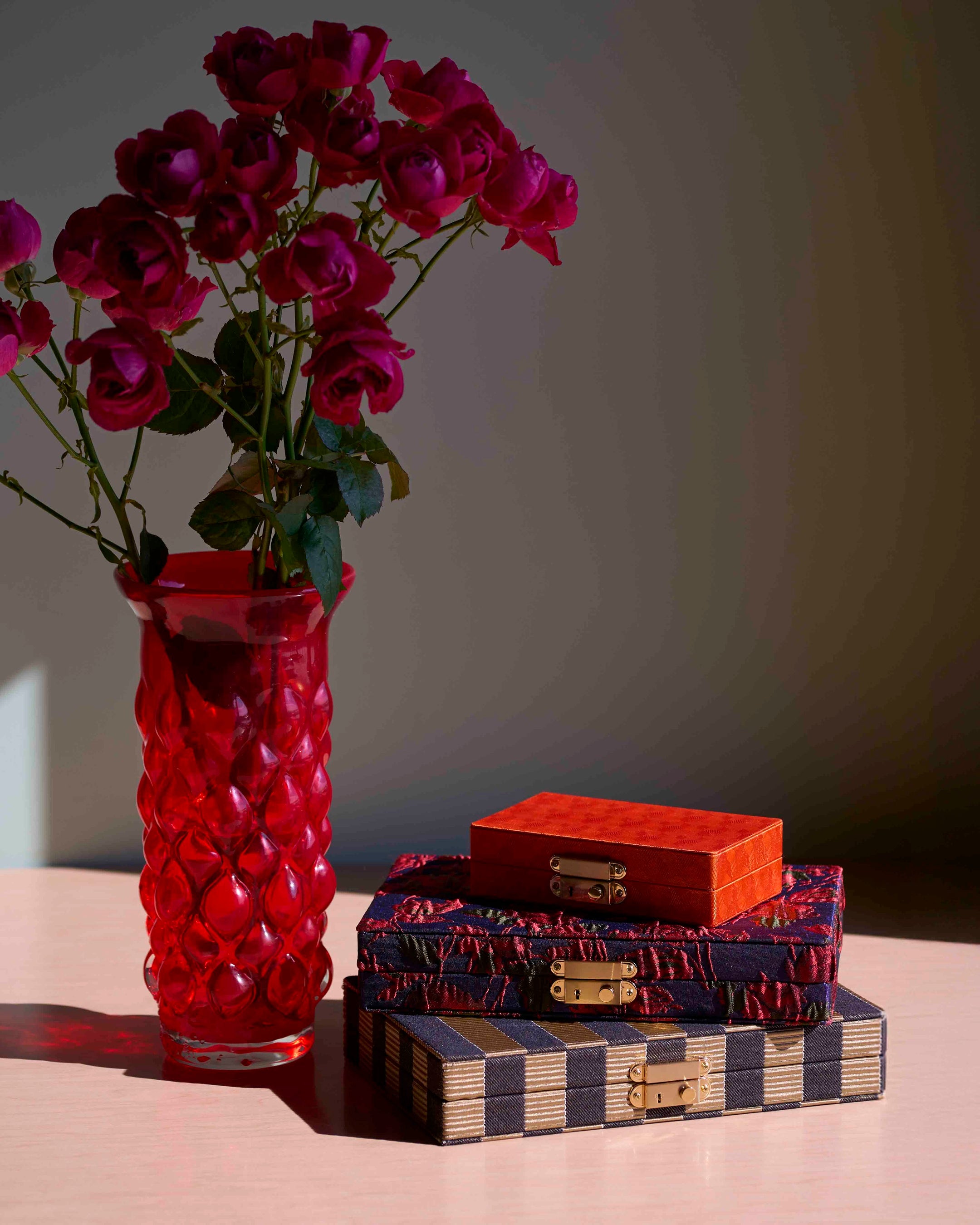元々はウェディングリングのボックス用に、石の買付の際に訪れた国々で収集してきたファブリック。大切に集められたアーカイブ生地は、ソファーやカーテンなどのインテリアファブリックとして使われる贅沢なジャガード生地。柄や厚みなど質感が異なる表情に合わせて国内の職人より丁寧に仕立てています。