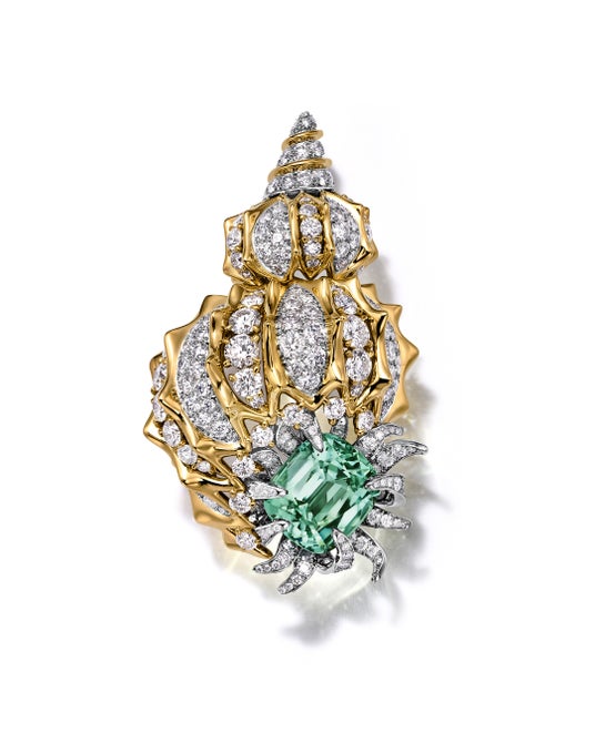「シェル」の章は、海がもたらす自然の造形美と質感を讃えています。プラチナとゴールドが波打つ曲線を描き、波の先端にはホワイト ダイヤモンドとイエロー ダイヤモンドがセットされた立体感のあるクリエイションです。目を奪うほどに美しい「シェル」のブローチは、8.62カラットのグリーン トルマリンを主役に、ホラガイの非対称性を大胆に表現しています。