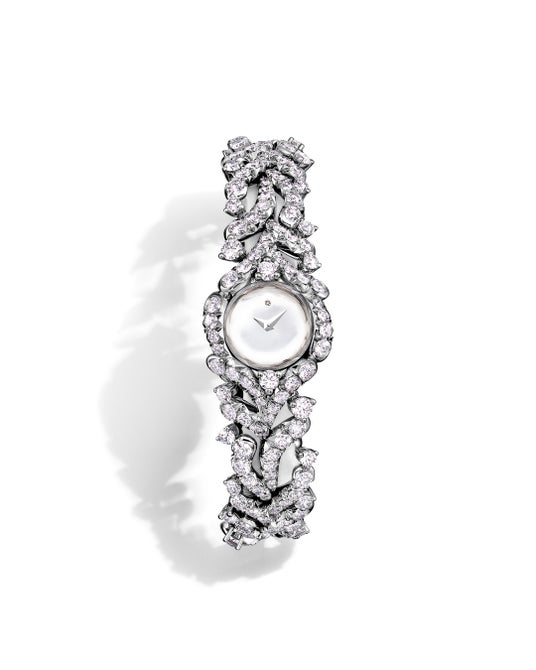「オーシャン フローラ」の新作として登場するのは、唯一無二のハイジュエリー タイムピースです。マザー オブ パールの文字盤には12時のインデックスにターコイズが配され、同デザインのダイヤモンド ブレスレットの装飾を組み合わせた傑作です。