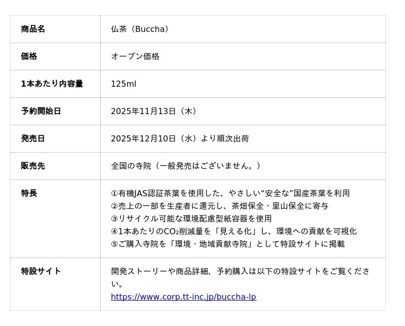 お寺の課題解決を通じて、地域社会の活性化を目指す株式会社TERA Tech Inc.(本社:東京都渋谷区、代表取締役:森 篤史、以降は当社)は、「飲むだけで地域社会と茶畑の保全に参加できる」サステナブル緑茶飲料「仏茶(Buccha)」の予約販売を2025年11月13日(木)より開始します。また、「仏茶(Buccha)」を通じた地域・環境・里山貢献を拡大させるため、新たに2つのプログラムを開始します。
