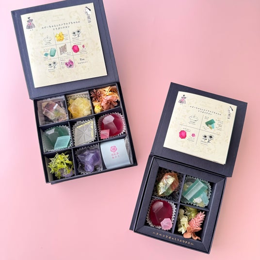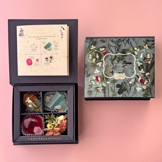 ハラペコラボの代表作である【琥珀糖・こうぶつヲカシ】は、寒天と砂糖をベースに、リキュールや果汁で風味を加え、天然由来の着色料で色合いを表現した寒天菓子です。職人が一つ一つ小刀で切り出すことで、どれひとつとして同じもののない、鉱物や宝石の美しい造形を生み出しています。こうぶつヲカシの表面は、砂糖が結晶化することで、シャリっとした食感、中はプルンとした食感が楽しめます。まるで、宝石や鉱物を食べるような特別な体験をお届けしています。今年の母の日のテーマは、物語とともに楽しめるギフト。元気いっぱいで好奇心旺盛な妹ルビーちゃんと、静かに星空や本を楽しむ姉エメラルドちゃん。性格の異なるふたりが、母の日に向けて心を込めて選んだ“宝石やお花”をモチーフに、「仲良しの姉妹がお母さんに贈る、とびきりのプレゼント」をお菓子やキャンドルで表現しました。