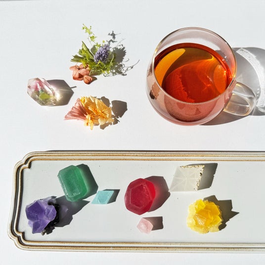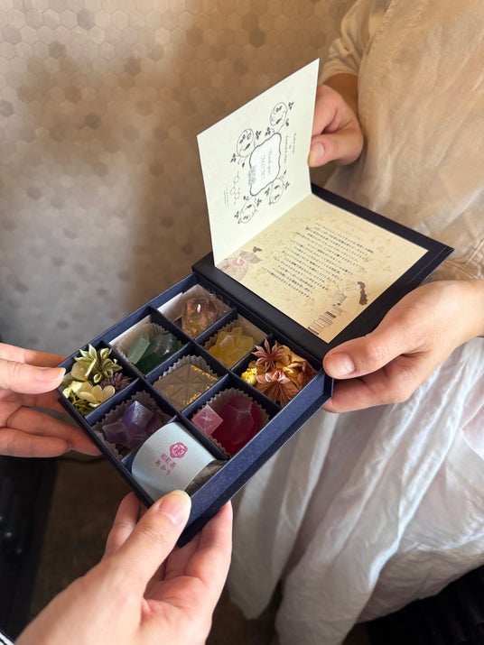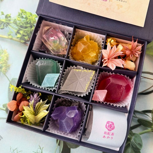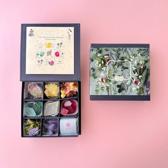 「ルビーちゃんとエメラルドちゃんのこうぶつヲカシ 9粒箱」は、ルビーとエメラルドを中心に、鉱物や宝石をイメージした【琥珀糖・こうぶつヲカシ】を詰め合わせました。さらに、和紅茶のティーバッグ、やさしく灯る鉱物型ジェルキャンドル、彩りを添えるドライフラワー添えて、まるで宝石箱を開けたようなときめきと、ゆったりとした癒しの時間をお届けします。ママの笑顔を思い浮かべながら、大切に詰め込んだ想いごと届ける、心あたたまる母の日ギフトです。【商品概要】