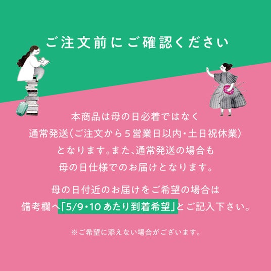 土日祝を除く3営業日以内に発送いたします。母の日近辺(5/9または10)にお届けを希望される方は、注文時「備考欄」に着日のご希望をお書きください。可能な限り対応させていただます。